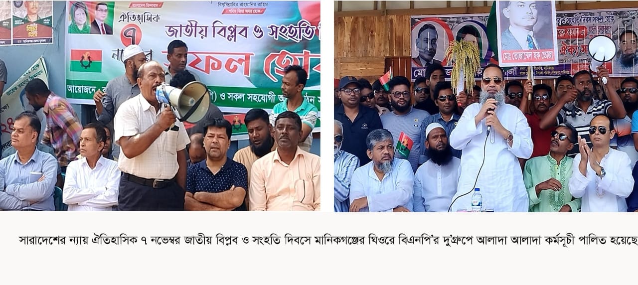 ঐতিহাসিক ৭ নভেম্বর জাতীয় বিপ্লব ও সংহতি দিবসে মানিকগঞ্জের ঘিওরে বিএনপি’র দু’গ্রুপে আলাদা আলাদা কর্মসূচী পালিত হয়েছে । এ উপলক্ষে