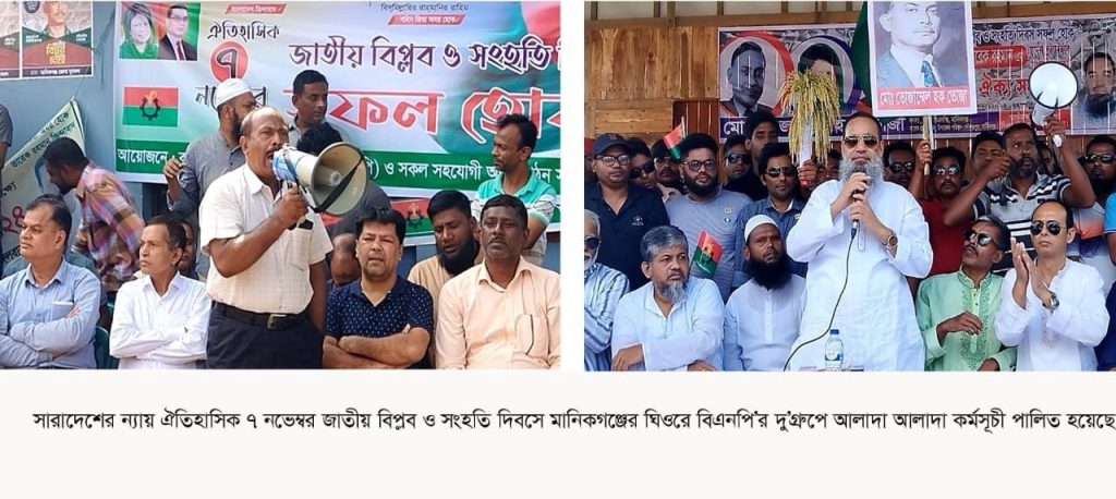 ঐতিহাসিক ৭ নভেম্বর জাতীয় বিপ্লব ও সংহতি দিবসে মানিকগঞ্জের ঘিওরে বিএনপি’র দু’গ্রুপে আলাদা আলাদা কর্মসূচী পালিত হয়েছে । এ উপলক্ষে সকাল বৃহস্পতিবার ১০ টায় উপজেলা বিএনপি ও সকল সহযোগী অঙ্গসংগঠনের নেতাকর্মীরা বাসস্ট্যান্ড থেকে বিশাল র্যালী ও মিছল নিয়ে বিভিন্ন স্থান প্রদক্ষিণ শেষে এক সমাবেশের আয়োজন করে। উপজেলা বিএনপি’র সভাপতি মীর মানিকুজ্জামান মানিক এ সমাবেশে সভাপতিত্ব করেন। এ সময় উপজেলা বিএনপি’র সাধারণ সম্পাদক এ্যাড. ওয়াজেদ আলী মিস্টার, সাংগঠনিক সম্পাদক আল-মামুন ভূঁইয়া, উপজেলা যুবদলের আহ্বায়ক মোঃ মাসুদুর রহমান সহ যুবদল, স্বেচ্ছাসেবক দল ও ছাত্রদলের নেতাকর্মীরা উপস্থিত ছিলেন।